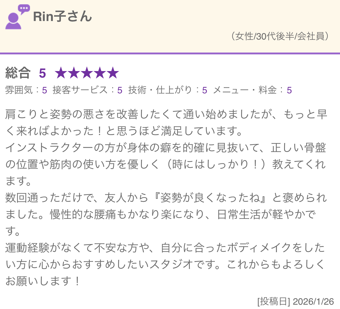 当スタジオではお客様のお悩みに合わせて計画を立て、しっかり説明した上でレッスンを行っておりますので納得して不安なく通っていただけます。