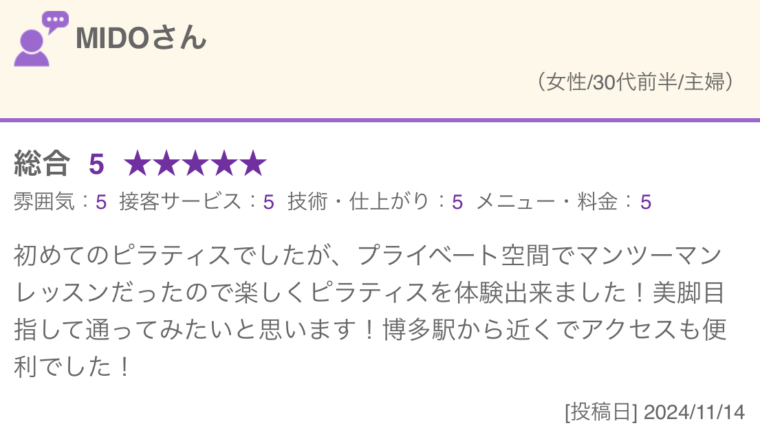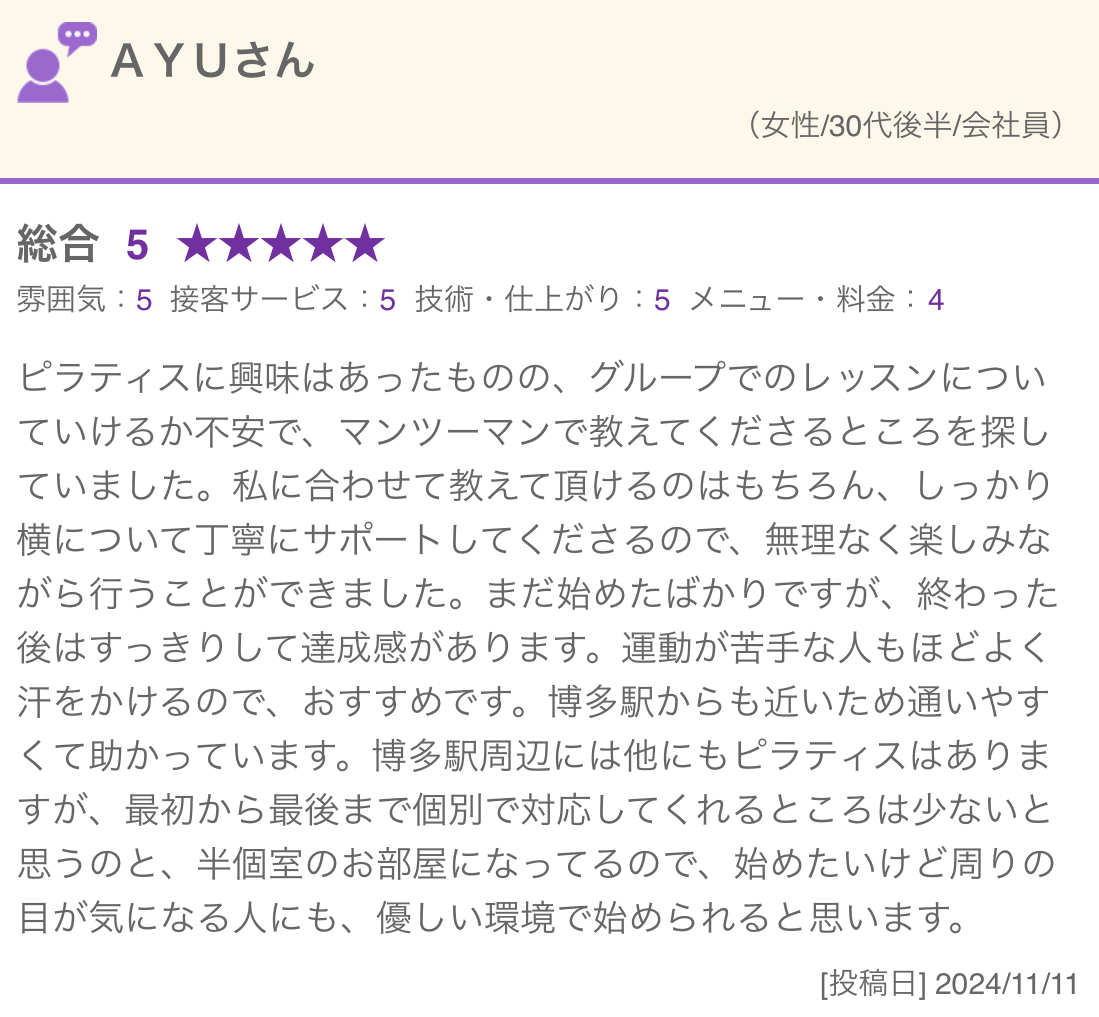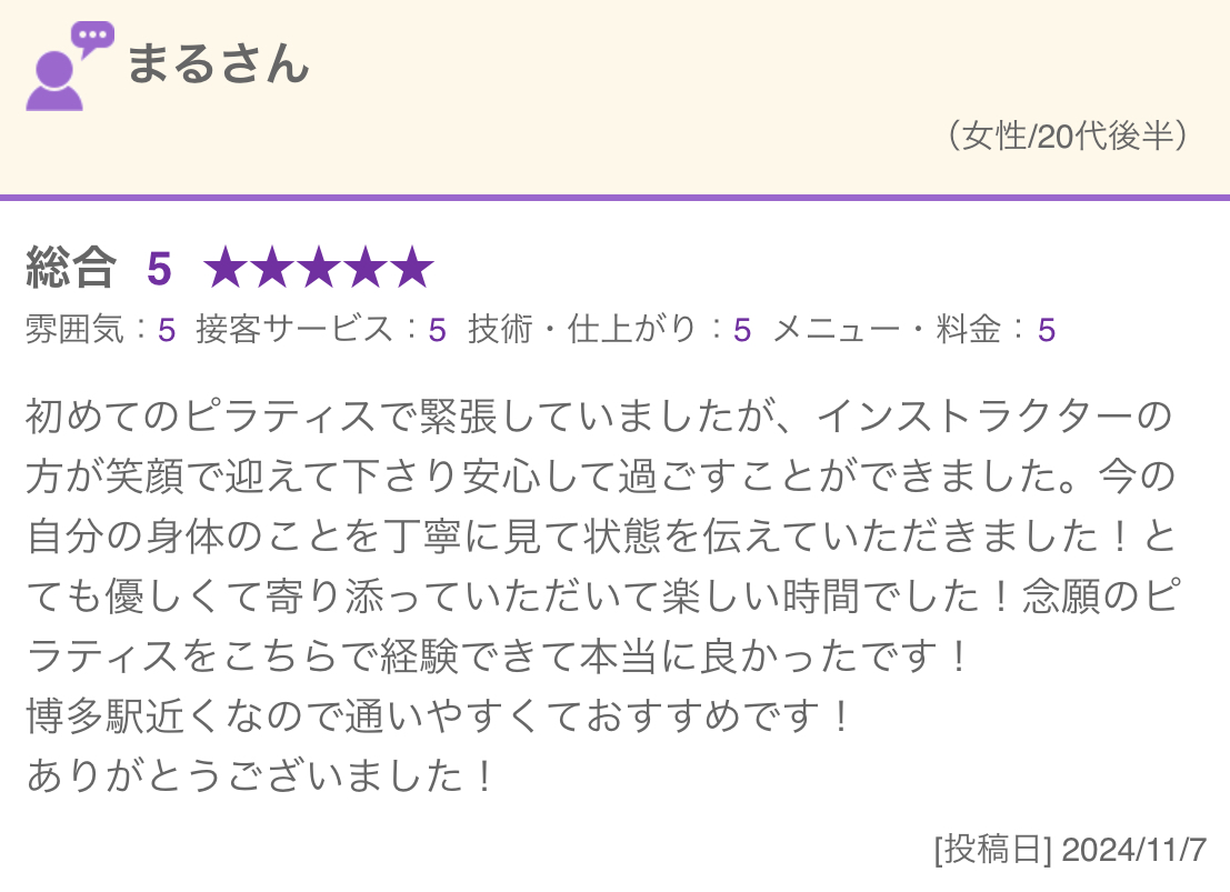 当店はインストラクターとお客様が1対1のプライベート空間になります。人の目を気にせず、集中してピラティスのレッスンを安心して受けることができます。